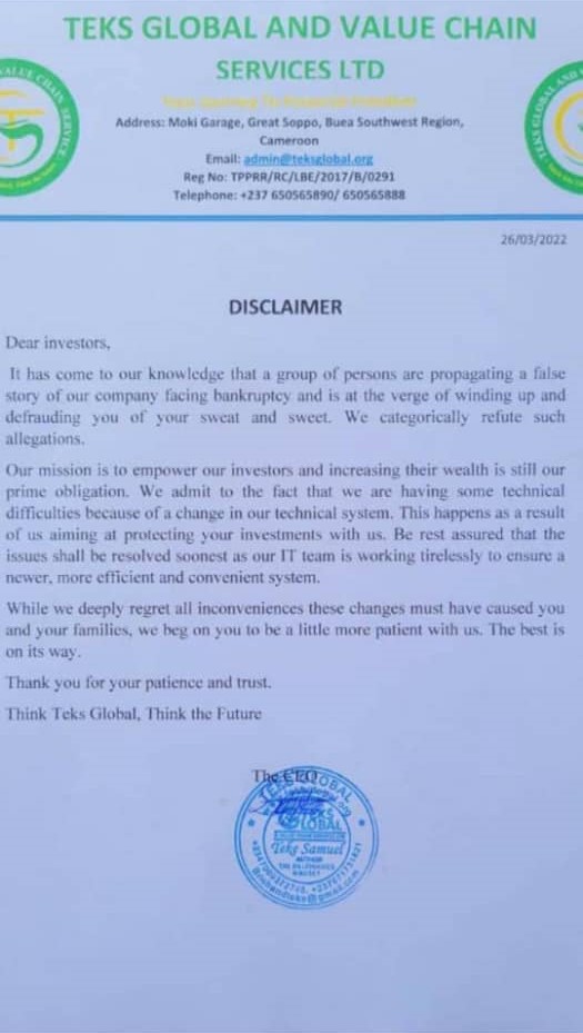 So why has Teks Global not been able to pay investors after receiving millions of FCFA to invest in agriculture and pay their dues accordingly? Cameroon News Agency spoke briefly with the CEO and founder of Teks Global Teke Samuel, he told the reporter that he was going to respond to the questions ‘within the week’, that is beginning April 25, a day after the interview was requested. One week gone, this reporter reminded him again of his promise but got no response.