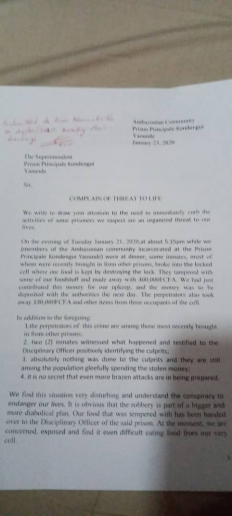 The letter reveals that on January 21, 2020, some newly admitted prisoners broke the locks into their cells and made away with the sum of FCFA 400,000 and foodstuff, meant for their upkeep. They were planning to give the administration to keep.