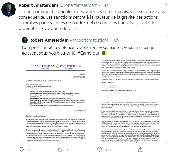 In his second letter dated September 25, 2020, Robert Amsterdam urged President Paul Biya to order the release of hundredths of opposition protesters arrested in Douala, Yaoundé, Bafang and Bafoussam, adding that this is in strict respect of freedom of expression which is a fundamental right.