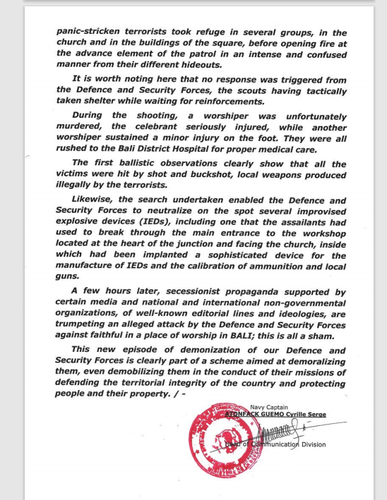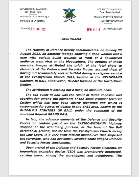 The PCC’s failure to directly indict Government forces in Bali Church shooting has given the Defense Ministry wings to fly and deny all allegations that Government forces did not carry out the attack that killed one woman and wounded the Pastor in Ntanfoang on Sunday, August 22, 2021.