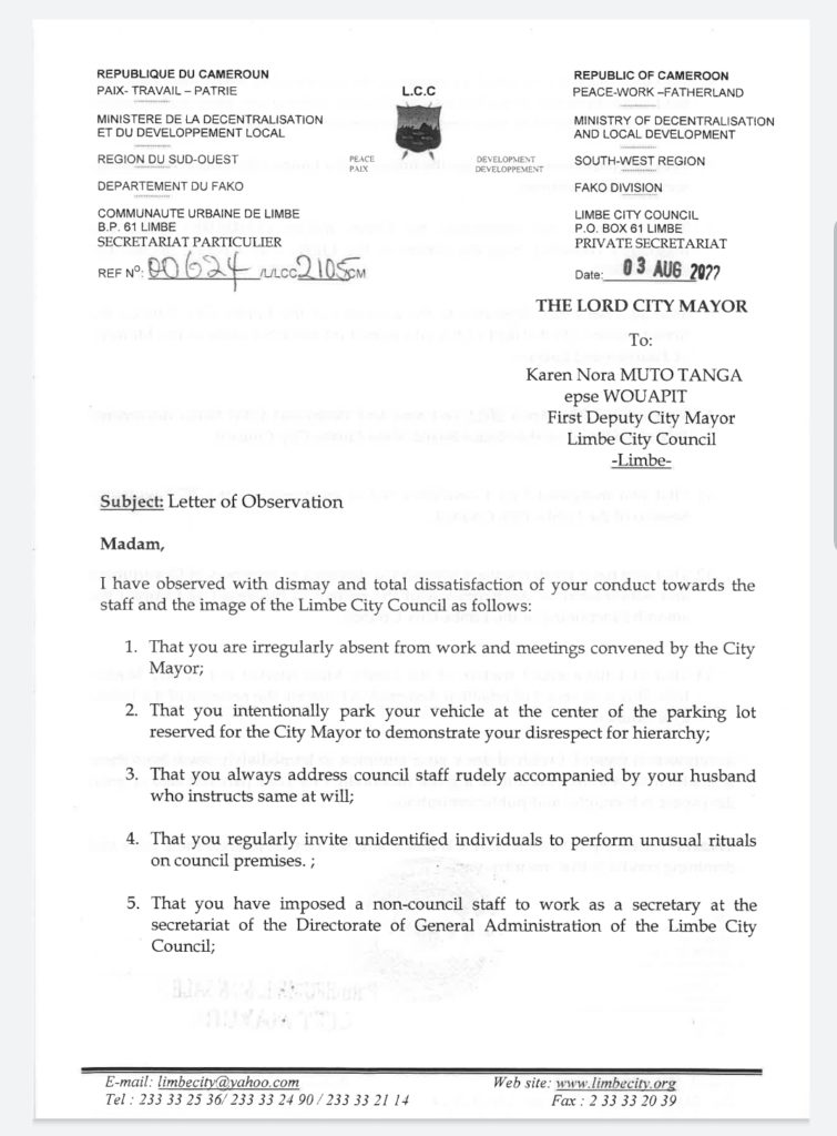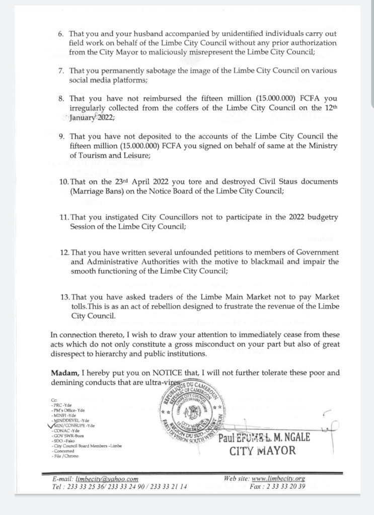 The said letter was sent to several offices including the Presidency, Supreme State Audit, CONAC, Prime Minister’s office, Ministries of Finance and Decentralization, SW Governor’s office, Fako SDO, Limbe City Council Board members.