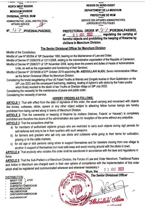 The Senior Divisional Officer (SDO) for the Menchum division, North West region, Abdoullahi Aliou, has prohibited the movement of people with cutlasses, knives, sticks and other deadly objects in his area of jurisdiction. This is contained in an order he signed on August 3rd 2022.