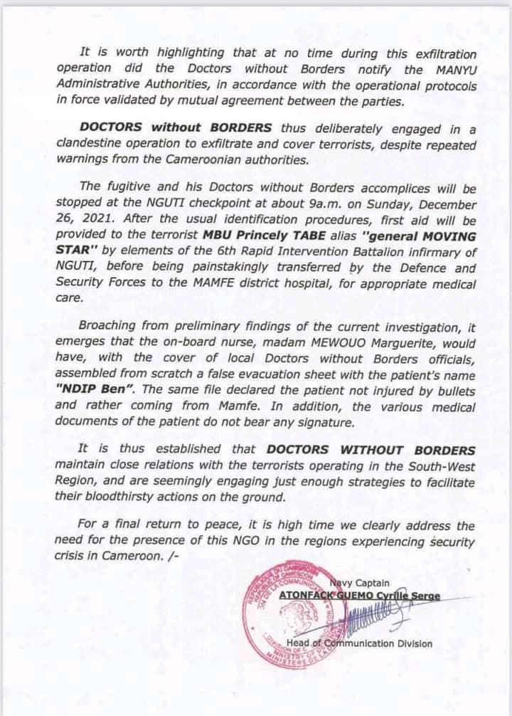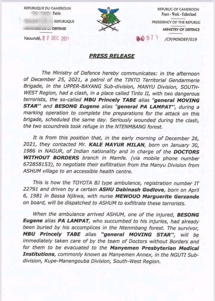 MINDEF Recommends Review of MSF Presence in Cameroon Conflict Regions