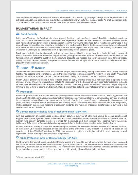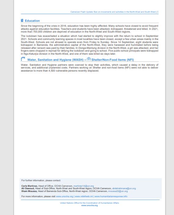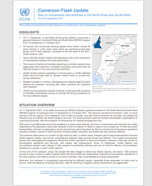 The United Nations Office for the Coordination of Humanitarian Affairs (OCHA) has detailed the devastating effects of the ban on movement and activities in the North West and South West regions, revealing that most schools have been closed except for a few schools in Urban areas and operating at less than 60% compared to the first week,