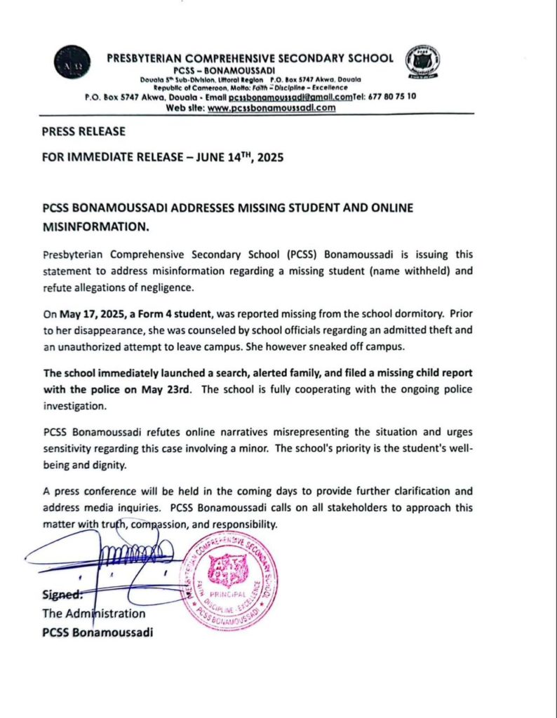 PCSS Bonamoussadi Student Vanishes: Family points finger at school