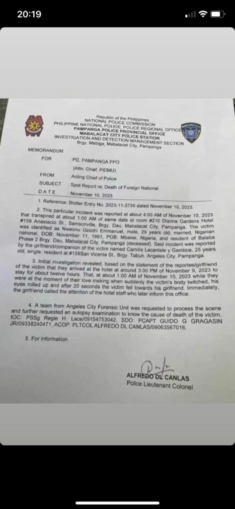 A Nigerian national, Nwaonu Uzuchi Emmanuel, 29, died on Friday November 10, 2023 in a hotel in Philippines in Mabalacat City in Pampanga neighborhood, Police report stated.