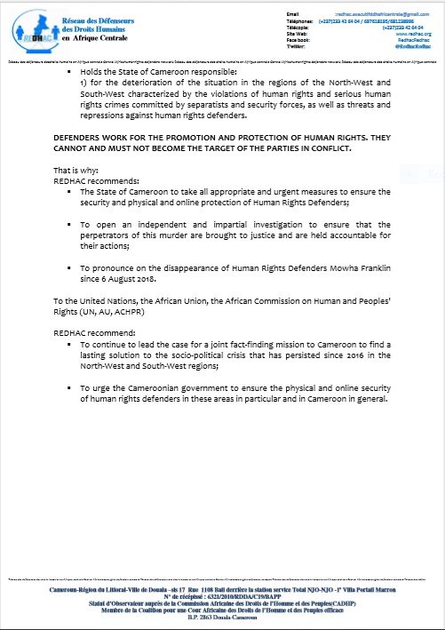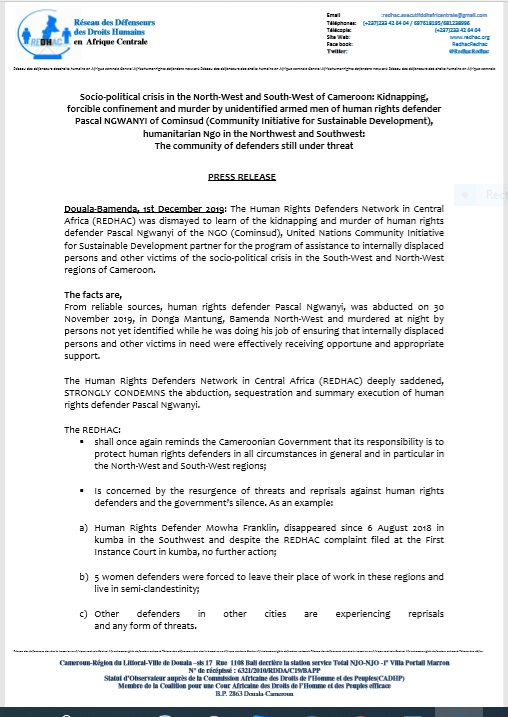 The Human Rights Defenders Network in Central Africa (REDHAC) says it was dismayed to learn fo the kidnapping and murder of human rights defender Pascal Ngwanyi of the NGO (Cominsud), United Nations Community Initiative for Sustainable Development partner for the program of assistance to internally displaced persons and other victims of the socio-political crisis in the South-West and North-West regions of Cameroon.