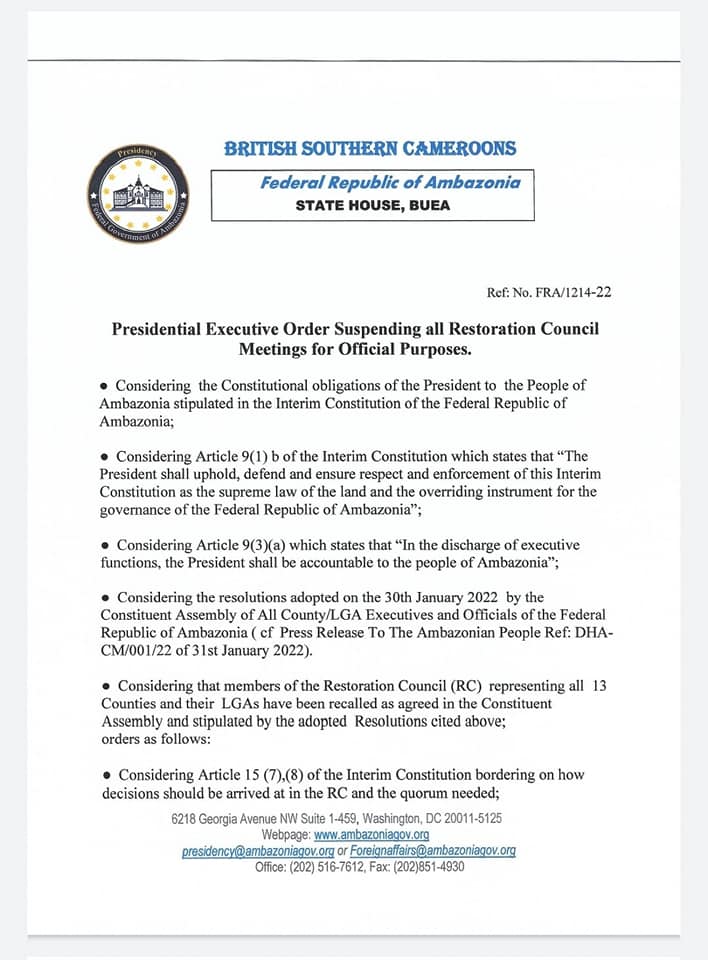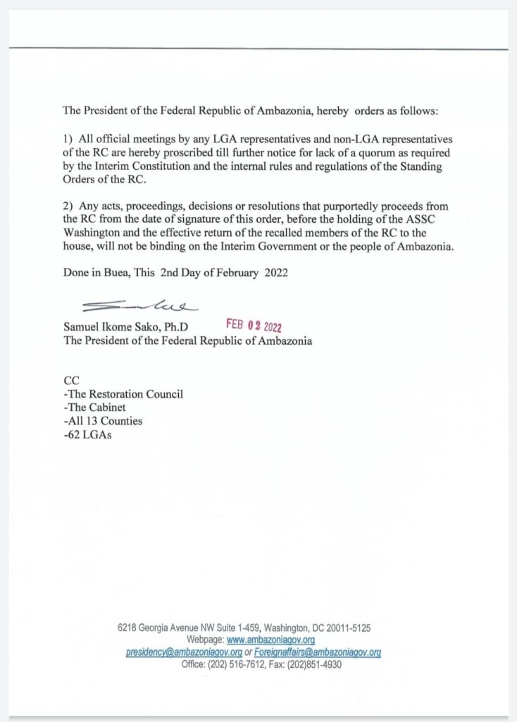 A few hours to his impeachment, Dr. Samuel Sako signed an Executive Order, suspending meetings of Local Government Area’s at the Restoration Council for lack of quorum. The Order also stated that any acts, proceedings, or decisions taken by the Council “will not be binding on the Interim Government or the People of Ambazonia”
