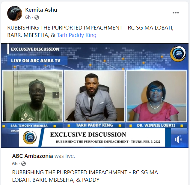 On ABC Amba Tv, a platform loyal to Samuel Sako, the Chairman of the Restoration Council’s Judicial Committee, Barrister Timothy Mbehesa, and others said the impeachment was “rubbish”.