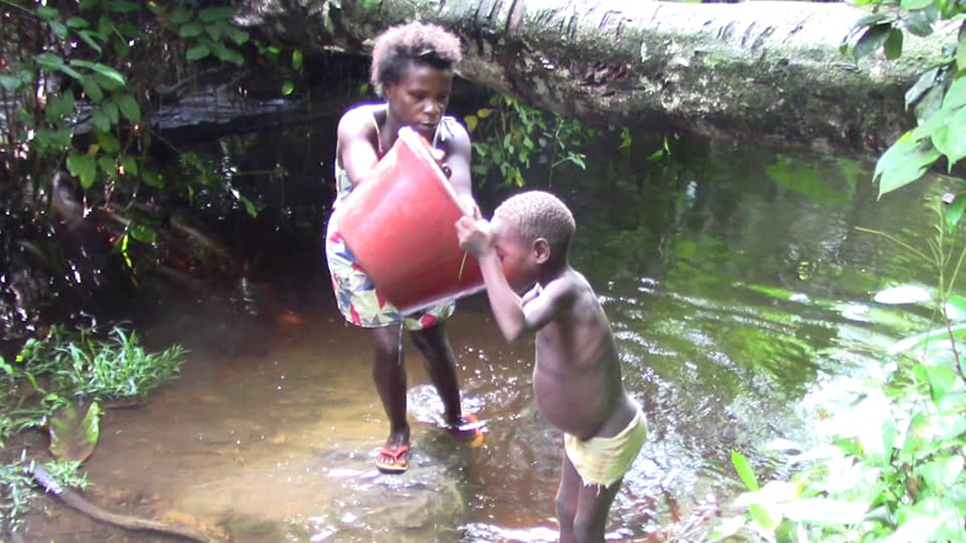 Pygmy family drinks from a swamp in Keinke, Cameroon, 2023. Picture Credit: Abunaw / Abena