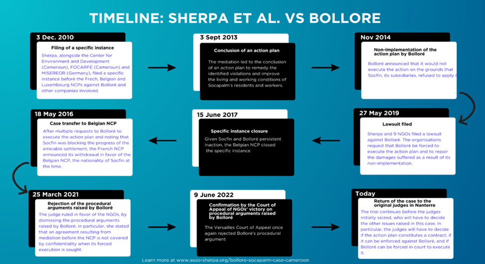 Timeline: Sherpa et al. vs. Bollore, Infographic design by Daniel Abugre Anyorigya, 2023. Source: www.asso-sherpa.org