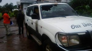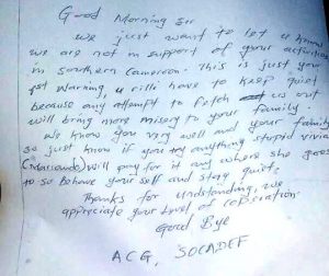 They set ablaze the front seat of the vehicle packed in the compound and dropped a note warning him to stay-off activities which would undermine the struggle of “Southern Cameroon”.