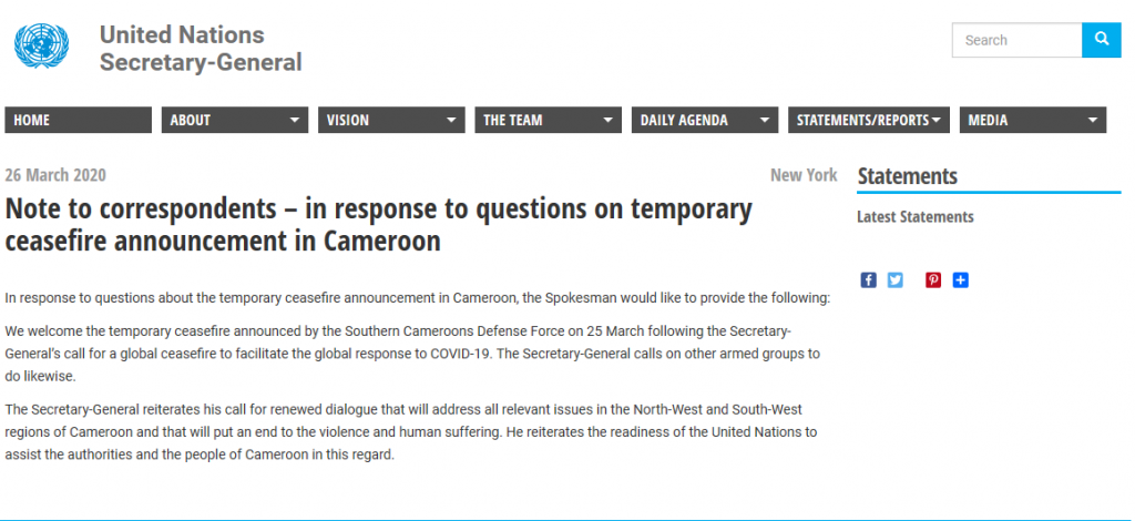 The Secretary-General of the United Nations, Antonio Guterres, has welcome a temporary ceasefire by the Southern Cameroons Defense Force, SOCADEF, calling on the Government and other forces to follow the example as the world battles the COVID19, the spokesperson has confirmed.