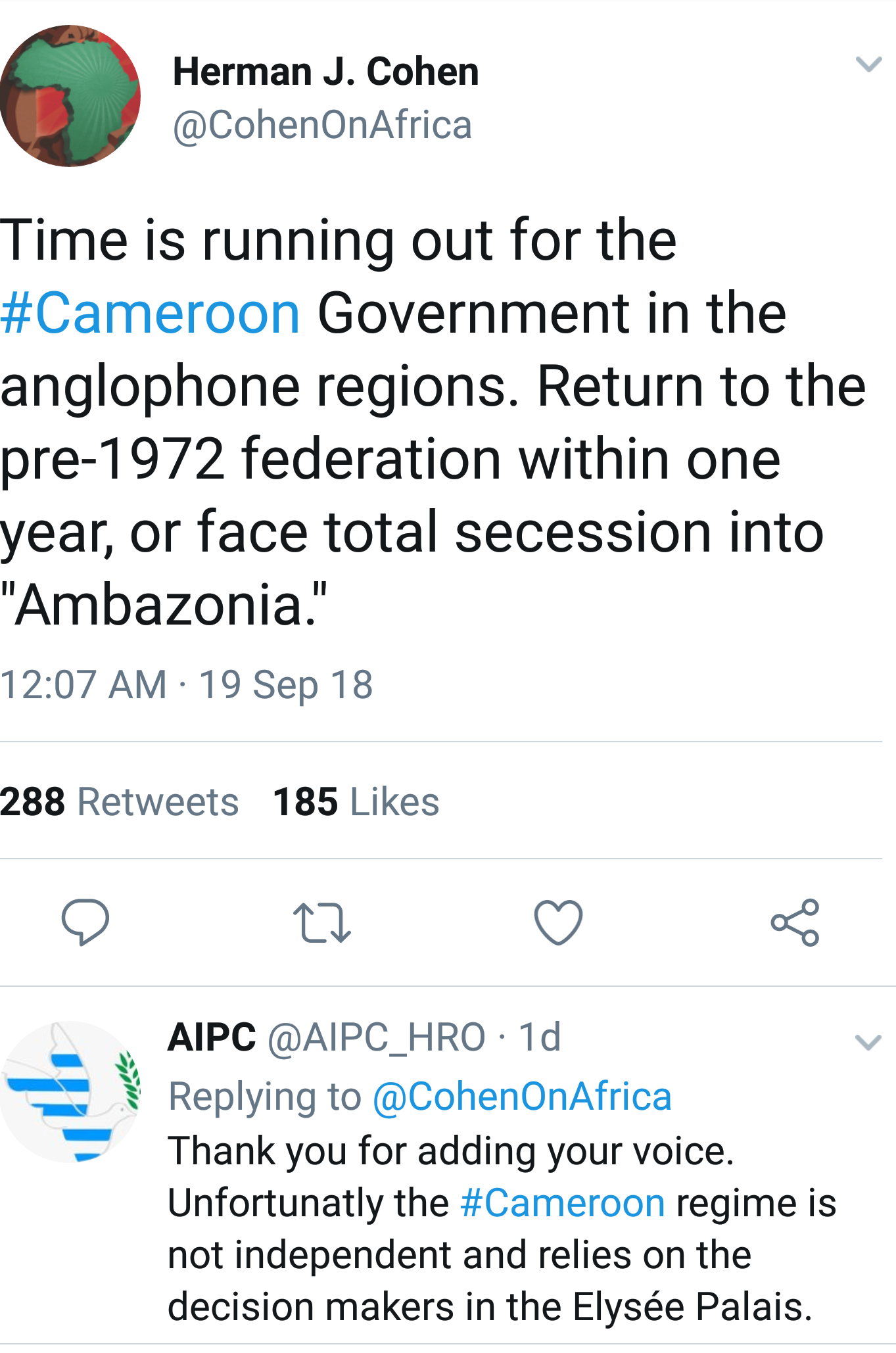 The former US Deputy Secretary of State for African Affairs, Herman J Cohen, has urged the Biya regime to return to the pre- 1972 Federal Status of the country or be ready to witness the complete separation of Southern Cameroon.