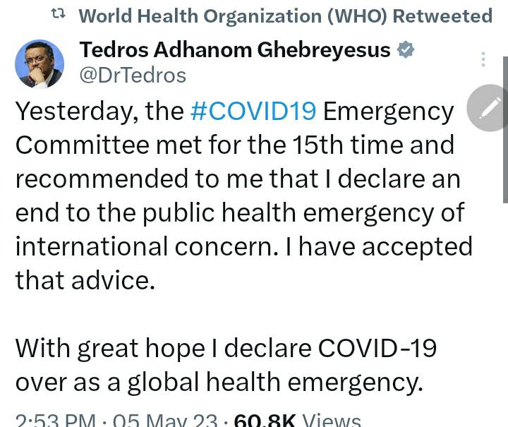 The World Health Organization (WHO) Director General, Dr Tadros Adhanom Ghebreyesus has declared an end to the covid-19 public health emergency of international concern.