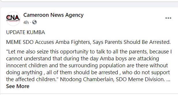 “Let me also seize this opportunity to talk to all the parents, because I cannot understand that during the day Amba boys are attacking innocent children and the surrounding population are there without doing anything, all of them should be arrested, who do not support the affected children.” Ntou’ou Ndong Chamberlin, SDO Meme Division, told reporters.