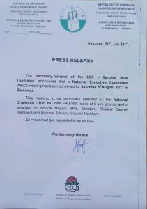 Bamenda, Cameroon- August 1, 2017-9:20(Cameroon News Agency) Speculations are rife that a meeting convened by the Secretary General of the Social Democratic Front Party, SDF, Senator Jean Tsomelou for this Saturday August 5, 2017 in Bamenda could have as discussion a possible campaign by the party for school resumption next academic year.